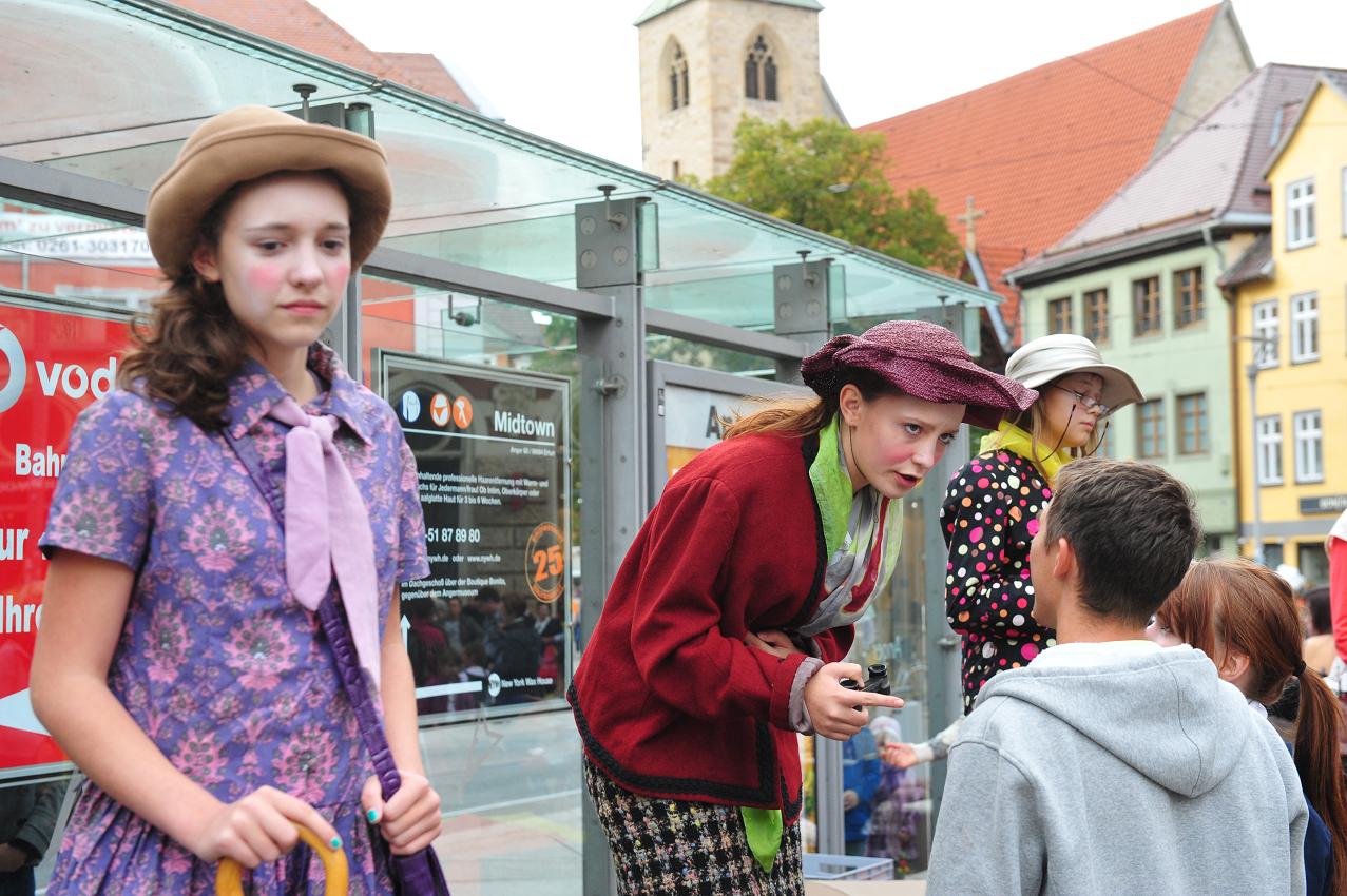 Das Straßentheater „ACH WISSEN SIE…“ knüpfte an die Technik des Panoptikums an: Figuren stehen bewegungslos auf kleinen Podesten, zu ihren Füßen eine Glocke, die durch einen Zuschauer/Passant ausgelöst werden kann. Daraufhin wird die Figur „lebendig“ und beginnt zu sprechen. In diesem Jahr entwickelten wir ein Panoptikum, dass auch unseren jüngeren Spielern die Möglichkeit bot, sich im öffentlichen Raum und vor unbekanntem Publikum im interaktiven Spiel zu versuchen. Gemeinsam mit der Gruppe entwarfen wir Figuren und Texte, die gut nachvollziehbar waren, klar und einfach in der Sprache. Wir erfanden „ältere“ Erfurter Bürgerinnen und Bürger, die mit den Touristen ins Gespräch kamen und über ihre Stadt Erfurt „schwatzten“. Allesamt begannen sie ihre Rede mit „Ach, wissen Sie…“ und dann erzählten sie über den Dom, den Waid, den Erfurt Senf oder waren sie stolz auf ihre Stadt, aber sie hatten – wie das so bei einem kleinen Schwatz ist – an dieser oder jener Stelle auch was zu meckern.