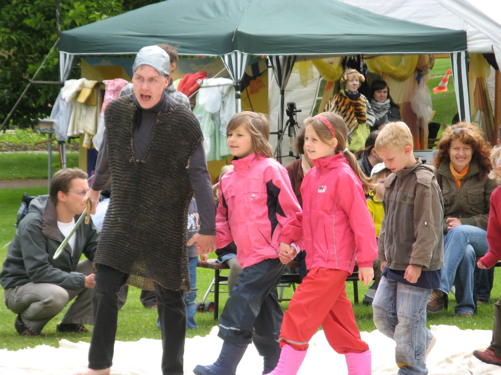Bei diesem Mitspieltheater begaben sich die Kinder mit zwei Figuren der Ritterzeit auf eine abenteuerliche Reise. Mal verwandelten sich die Kinder in die Wellen des Meeres, mal waren sie die tanzenden Höflinge im Burghof des Ritters, mal sollten sie die Gespenster im nächtlichen Wald beruhigen oder gegen einen mächtigen Sturm ankommen. Es waren viele „Gefahren“ und Aufgaben, die auf die Kinder zukamen. Bei dem Mitspieltheater ging es uns vor allem um die Möglichkeit, dass Kinder in das Spielgeschehen durch vorgegeben alternative Spielsituationen stimuliert wurden. Sie sollten Mutproben bestehen, sich für eine Spielerfigur einsetzen oder mit ihr gemeinsam ein Abenteuer bestehen. Die Mitspielresonanz war sehr groß.