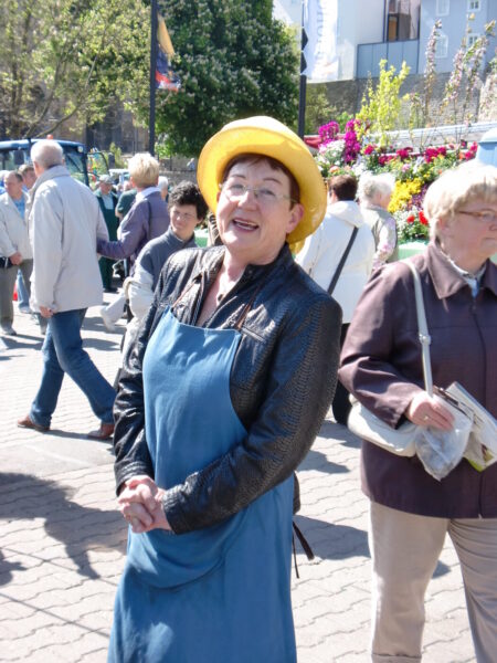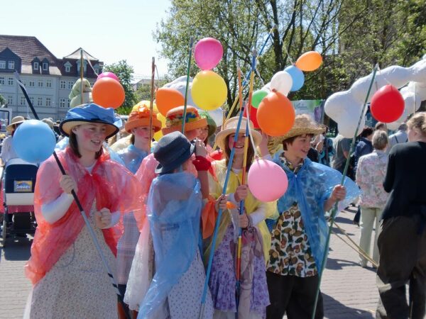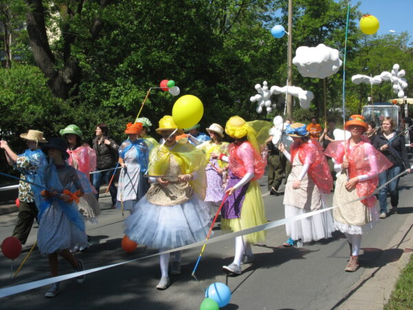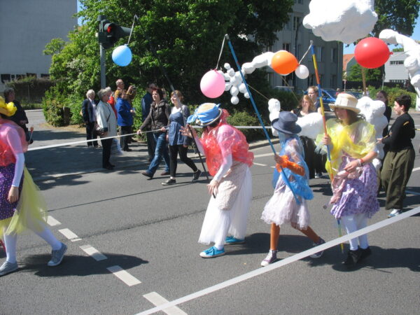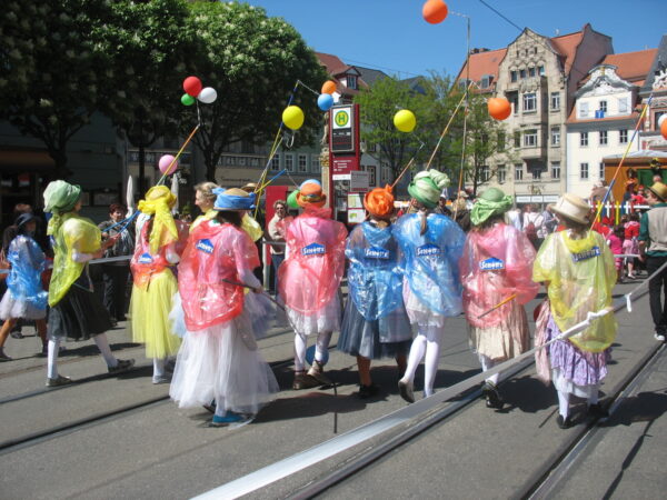 Die Schotte beteiligte sich mit farbigen Kostümen und einer Gärtner-Puppe, die für Wachsen und Blühen stehen sollte. 14 junge Darsteller umliefen und umspielten diese riesige Puppe und zogen drei Kilometer durch die Innenstadt. Anschließend betreuten wir einen Stand auf dem EGA-Gelände und luden ein zum Workshop mit dem Motto: Theater? – Selbst gemacht!