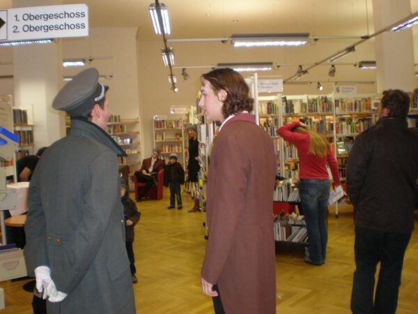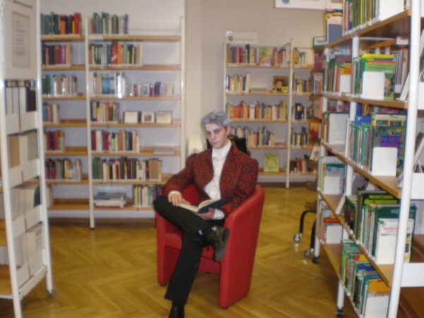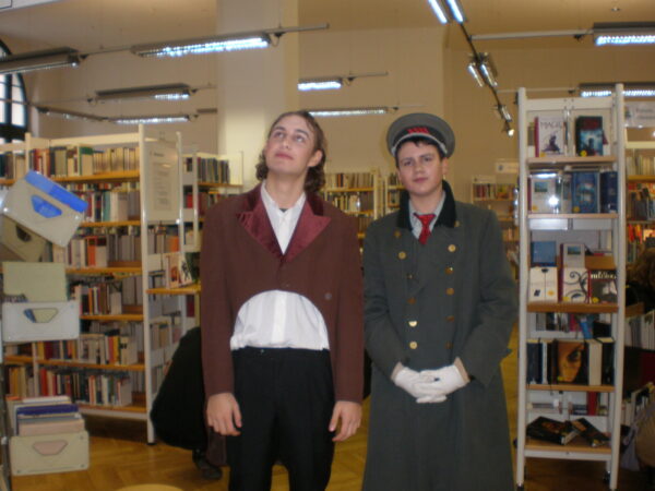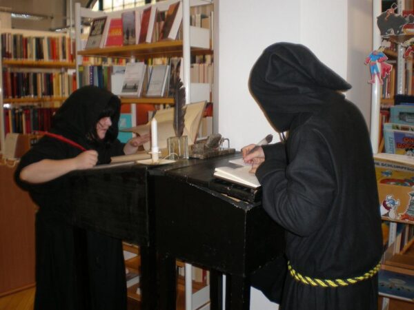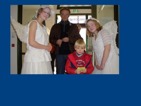 Die Bibliotheken in Deutschland feiern jedes Jahr am 24. Oktober den Tag der Bibliotheken. Sie gedenken damit der ersten öffentlichen Bibliothek, die am 24. Oktober 1828 durch den sächsischen Rentamtmann Karl Benjamin Preusker in Großenhain (Sachsen) für Lehrer und Schüler eingerichtet wurde. Für diesen Gedenktag entwickelten wir eine leise und unaufdringliche Performance, die während der regulären Öffnungszeit der Stadtbibliothek aufgeführt wurde. Dabei lehnten wir uns an literarische Figuren aus bekannten Romanen von Robert Musil, Thomas Bernhard, Ludwig Börne oder Elias Canetti an und erweckten sie so zum Leben. Darüberhinaus erfanden wir Menschen, die mit Büchern tagtäglich arbeiten: Mönche, Vorleser, Bibliothekare und Archivare. In einem gewissen Sinne auch Engel.