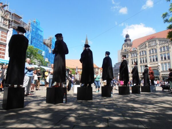 Im Jubiläums- Jahr der Reformation durften Reden des Reformators nicht fehlen. Überall wurde Luthers Donnerjahres 1517 gedacht, selten nur kam er selber zur Sprache. Wir hatten deshalb das Projekt LAUTER LUTHER einstudiert und zweimal zum Erfurter Kirchentag gespielt. 8 Luther-Figuren, alle im selben Outlook, standen auf erhöhtem Sockel und predigten aus Luthers Werken oder dessen Tischreden. Ergänzt wurden sie durch Äußerungen von Luthers Frau Katharina von Bora und 2 Kindern aus deren Ehe. So entstand ein kleines Panorama zu Luthers Leben und Reden und eine gut angenommene Aktion durch die Teilnehmer des Kirchentags und den Erfurtern.