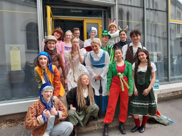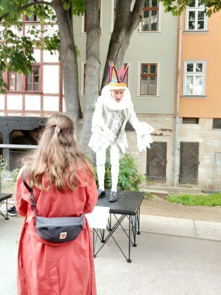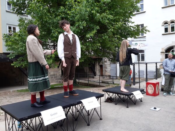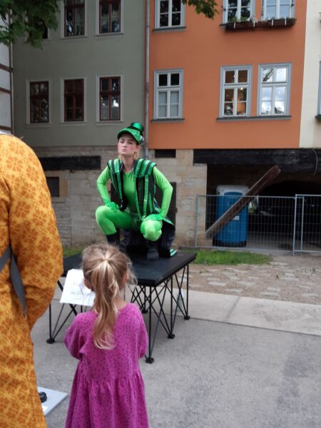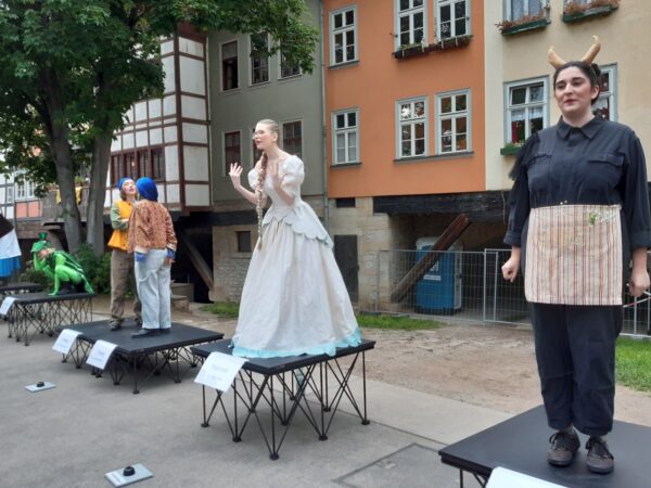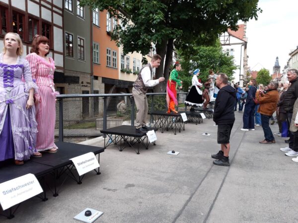 Das Straßentheater „Grimms Märchen“ ist ein Panoptikum für speziell jüngere Zuschauende. Bekannte und weniger bekannte Märchefiguren erzählen hier von ihren tragisch komischen Schicksalen.