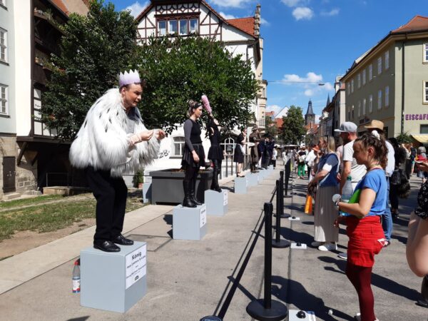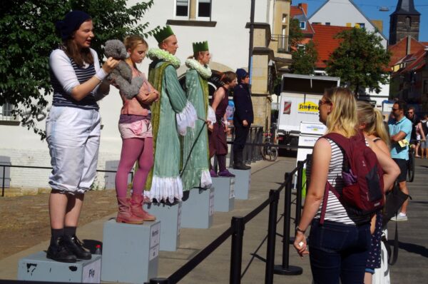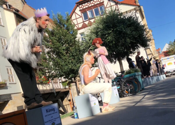 Minimonologe und Zwiegespräche aus unseren aktuellen Inszenierungen, zeigen wir auf kleinen Bühne unter freiem Himmel. Das vorbeischlendernde Publikum wird Antigone, Tartuffe, Macbeth und Co via Fußklingel zum „spielen bringen“ können. Mal glühend herzzerreißend, mal liebreizend kampfeslustig, ganz nach dem Motto: „Lasst mich den Löwen auch noch spielen“ – bringen unsere jungen Darstellenden ein Stück „SCHOTTE Bühne“ auf die Straße.