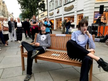Bei „Nichts wie hin und WARTEN“ handelt es sich um das Probieren, Ausprobieren und das stete Versuchen der SpielerInnen, Theaterformen in den öffentlichen Raum der Stadt zu bringen, ohne vorgegebenen Texte oder Figuren – mit kleinen Miniaturen, mit Sprache, mit Bewegung und untersucht die Reaktionen und das Zusammenspiel mit dem Publikum, Touristen und Passanten.