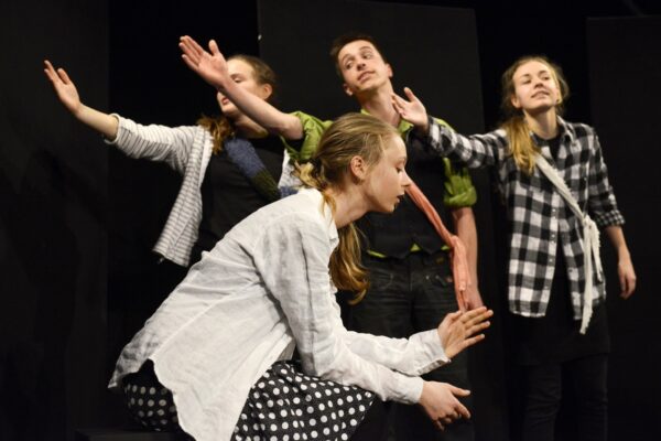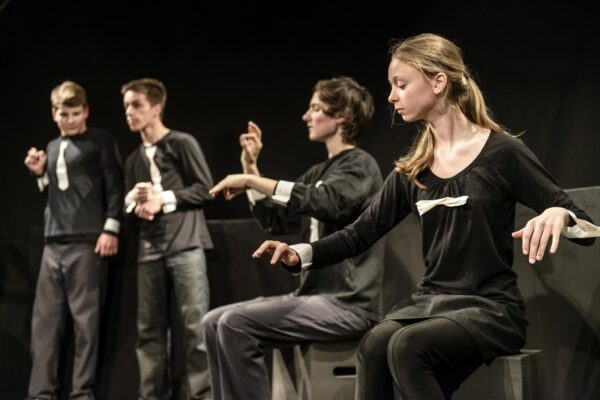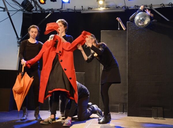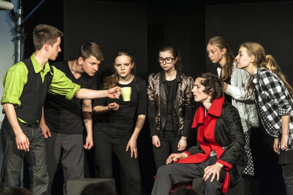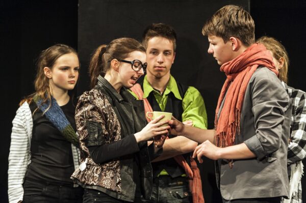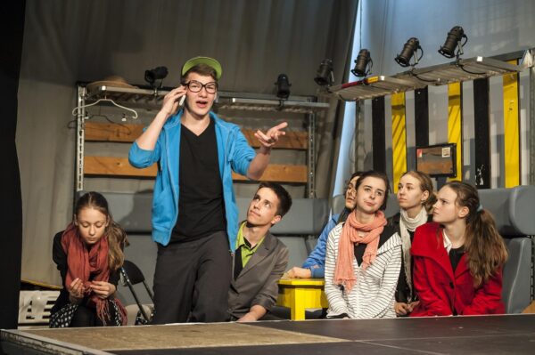 Alle sitzen auf den Plätzen und eigentlich könnte die Führung durchs Theater beginnen. Doch es gibt mal wieder mächtig Theater im Theater – keiner weiß Bescheid: Chaos pur. Was nun? Sieben theaterbegeisterte Jugendliche machen aus der Not eine Tugend. Sie spielen sich selber die ausgefallene Theaterführung vor, kreuzen quasi per Anhalter durch das Theaterhaus – in die Kantine, den Fundus, die Probebühne und den Orchestergraben – geben den Klischees kräftig Zucker und zwinkern dabei immer mit den Augen…