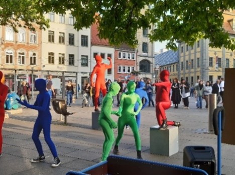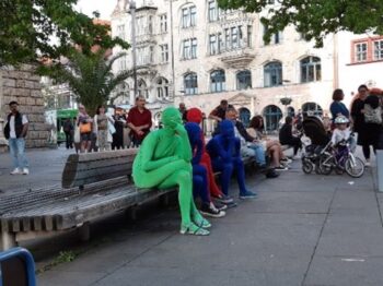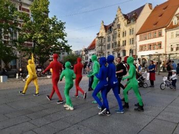 „Die ganze Welt ist Bühne.“ Unsere Silly Walks – Gruppe nimmt das wörtlich und mischt sich in Ganzkörperanzügen (sog. Morphsuits) unter die Passanten. Wartend, Zeitung lesend, im Gespräch vertieft – mit ganz alltäglichen Handlungen ziehen diese bunten Gestalten, allein ihres Aussehens wegen, die Blicke der Umstehenden auf sich und sorgen so für winzige humoristische Irritationen. Mit einer Gruppe von rund 10 SpielerInnen fanden Auftritte u.a.statt: