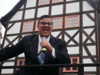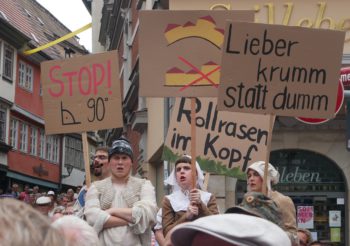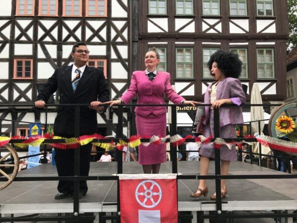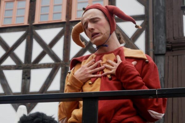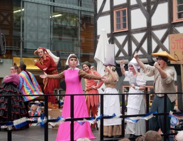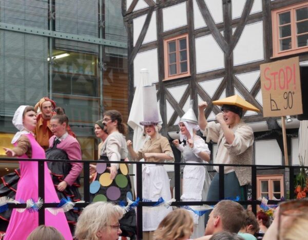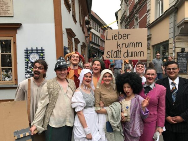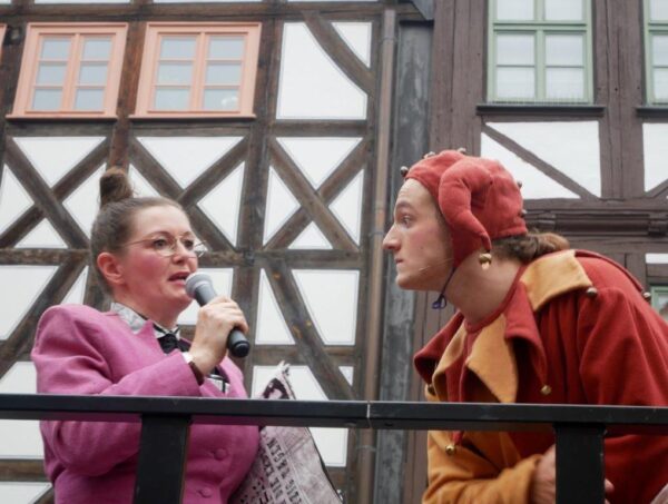 Till Eulenspiegel ist mit seinem Cousin nach Erfurt gekommen, um vom Hausbau zu erfahren. Seine Idee: eine Eigenheimwiese mit Hüttchen neben der Krämerbrücke für seine liebste Tilla von der Alm und seinen Esel Kasimir. Erfurter Stadtvertreter rufen zu jener Zeit einen neuen Stadtschreiber aus – das ist doch DIE Möglichkeit für Till, dichtend an sein Ziel zu kommen. Denn eines kann Eulenspiegel: Geschichten erzählen, erfinden und vor allem anzetteln! Die Erste lässt nicht auf sich warten: Die Stadtväter bekommen Angst vor der Krämerbrücke und noch mehr vor den Krämern, die eine Revolte starten. Denen gefällt es nicht, dass ihre Häuser ins Programm „Schnörkellos mit Bauhaus“ fallen sollen. Gutes Futter und ein schönes Spektakel für den nun selbst ernannten fleißigen Stadtschreiber Till nebst seinem Cousin-Sekretär. Schließlich gerät er ins verbale Kreuzfeuer der beiden Fronten. Till wäre nicht Till, wenn er am Ende nicht die Puppen tanzen lassen würde und dieses Mal sogar die Krämer mit den Stadtvertretern.