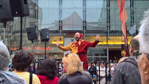 Er macht nun mit dem Esel auf dem Benedikplatz eine kurze Pause, damit sich der Esel erholen kann.
