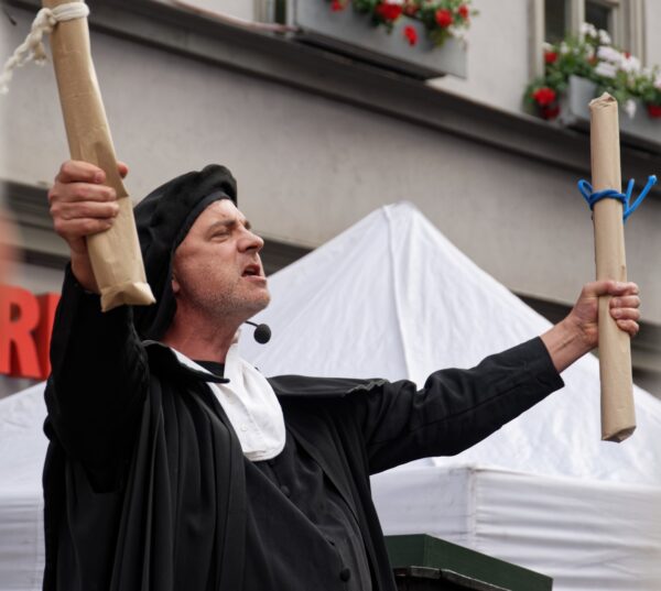 Till Eulenspiegel ist wieder in der Stadt. Diesmal leitet er einen hochtheologischen Schlagabtausch zwischen dem Wittenberger Professor Martin Luther und dem römischen Papst Leo X. Es geht um die Frage, wer in der Kirche das Sagen haben soll: Papst oder Bibel? Auch die geladenen Kronzeugen der Zeit können sich nicht einigen und geraten in ein Handgemenge. Eulenspiegel droht mit dem Zorn Gottes und kann dadurch Schlimmeres verhindern. Die Klärung der Machtfrage allerdings verschiebt er kurzerhand aufs nächste Jubiläum – in 100 Jahren!