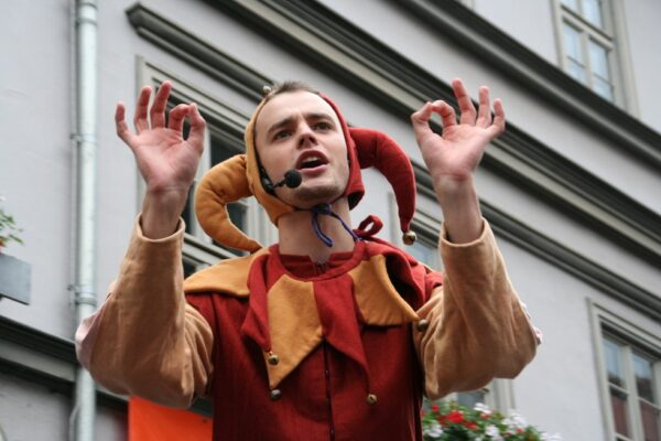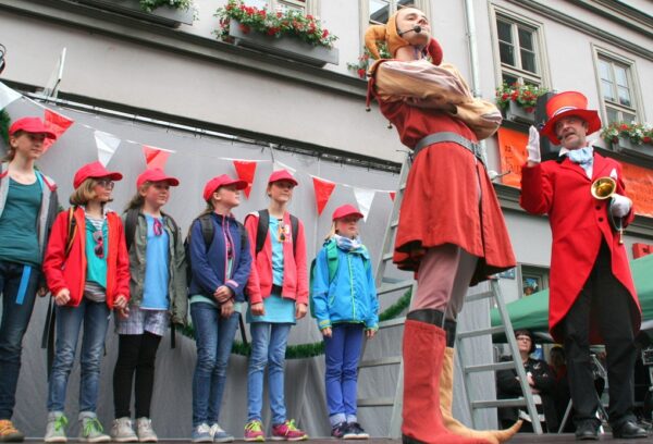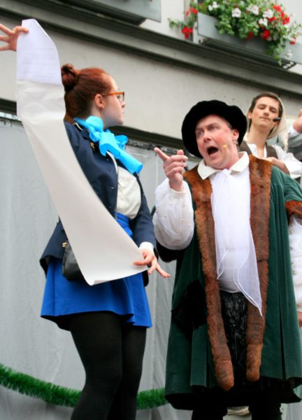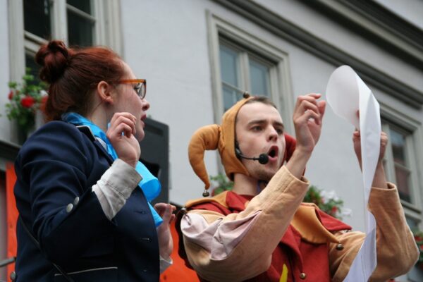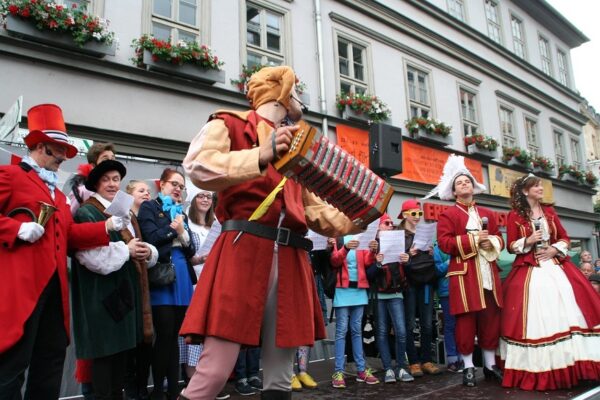 Wie schon im letzten Jahr wurde auch das 40. Krämerbrückenfest durch ein Spiel mit Till Eulenspiegel eröffnet. 20 Jugendliche der Schotte spielten und sangen auf der Bühne am Benediktsplatz. Das rund halbstündige Programm nahm die alte Allianz zwischen Erfurt und Mainz wieder auf. Zum Jubiläum des Krämerbrückenfestes hatte sich eine Mainzer Delegation angesagt und die wollten mit einem angemessener Hochkultur empfangen werden – die Ehre der Stadt stand plötzlich auf dem Spiel. Weder dem Bürgermeister noch dem Kulturdirektor fiel aber etwas ein.