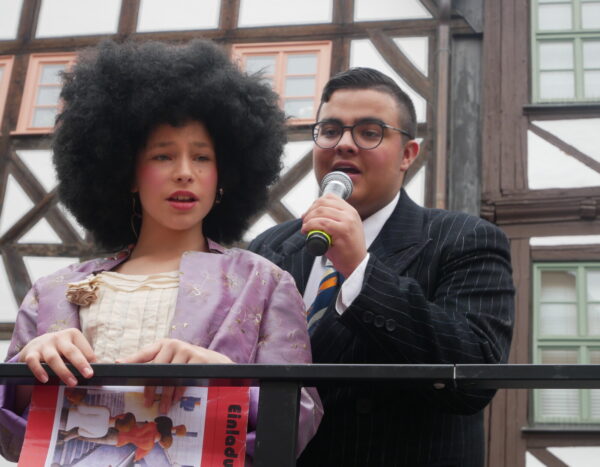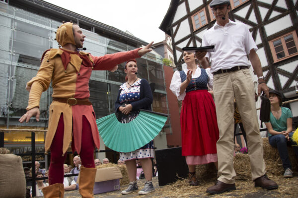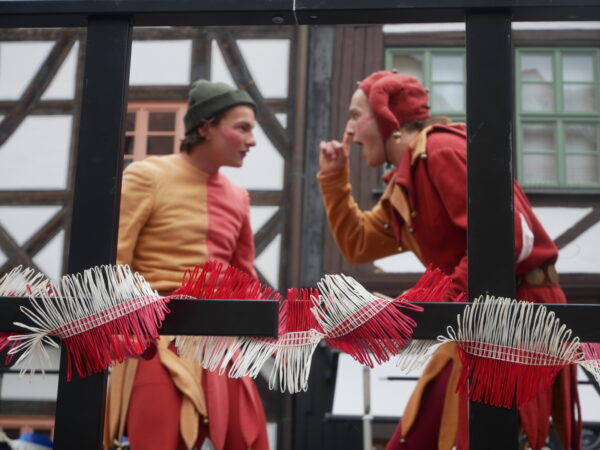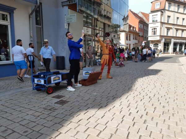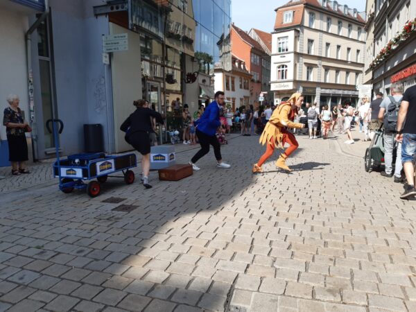 Till Eulenspiegel ist als Stadtführer unterwegs. Er führt auf eigene Faust kleine Gruppen durch die Stadt. Von der Krämerbrücke kommend, hat er endlich den Benediktsplatz erreicht.